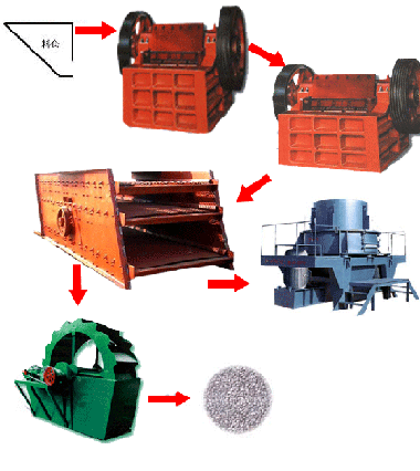 沙石生產線,砂石生產線,砂石生產線設備,砂石線,砂石生產設備基本流程:大塊石料經料倉由振動給料機均勻地送進鄂式破碎機進行粗碎,粗碎后的石料由皮帶輸送機送到反擊式破碎機進行進一步破碎;不滿足粒度要求的石子由皮帶輸送機返料送到反擊式破碎機進行再次破碎,形成閉路多次循環(huán)。